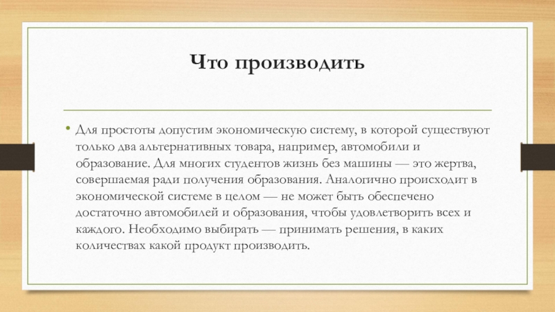 альтернативных товара, например, автомобили и образование. Для многих студентов жизнь без машины — это жертва, совершаемая ради получения образования. Аналогично происходит в экономической системе в целом — не может быть обеспечено достаточно автомобилей и образования, чтобы удовлетворить всех и каждого. Необходимо выбирать — принимать решения, в каких количествах какой продукт производить.