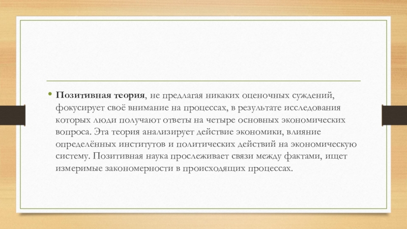 Слайд 10Позитивная теория, не предлагая никаких оценочных суждений, фокусирует своё внимание на