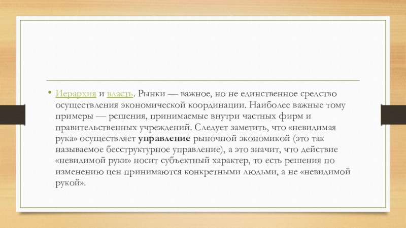 Слайд 12Иерархия и власть. Рынки — важное, но не единственное средство осуществления экономической координации. Наиболее