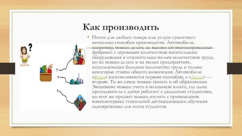 Автомобили, например, можно делать на высоко автоматизированных фабриках с огромным количеством капитального оборудования и относительно малым количеством труда, но их можно делать и на малых предприятиях, использующих большое количество труда и только некоторые станки общего назначения. Автомобили «Форд» изготавливаются первым способом, а «Лотус» — вторым. То же самое можно сказать и об образовании. Экономике можно учить в маленьком классе, где один преподаватель у доски работает с двадцатью студентами, но этот же предмет можно изучать с применением компьютерных технологий дистанционного обучения одновременно для сотен студентов.