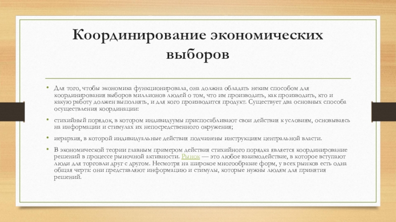 способом для координирования выборов миллионов людей о том, что им производить, как производить, кто и какую работу должен выполнять, и для кого производится продукт. Существует два основных способа осуществления координации: