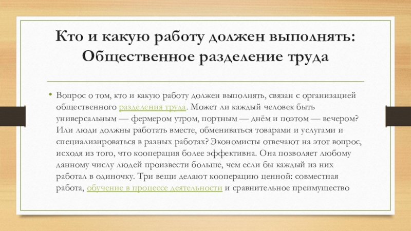 кто и какую работу должен выполнять, связан с организацией общественного разделения труда. Может ли каждый человек быть универсальным — фермером утром, портным — днём и поэтом — вечером? Или люди должны работать вместе, обмениваться товарами и услугами и специализироваться в разных работах? Экономисты отвечают на этот вопрос, исходя из того, что кооперация более эффективна. Она позволяет любому данному числу людей произвести больше, чем если бы каждый из них работал в одиночку. Три вещи делают кооперацию ценной: совместная работа, обучение в процессе деятельности и сравнительное преимущество