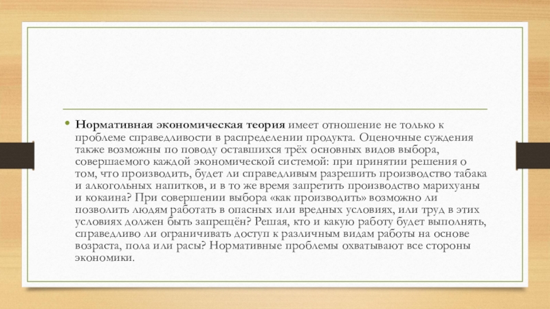 продукта. Оценочные суждения также возможны по поводу оставшихся трёх основных видов выбора, совершаемого каждой экономической системой: при принятии решения о том, что производить, будет ли справедливым разрешить производство табака и алкогольных напитков, и в то же время запретить производство марихуаны и кокаина? При совершении выбора «как производить» возможно ли позволить людям работать в опасных или вредных условиях, или труд в этих условиях должен быть запрещён? Решая, кто и какую работу будет выполнять, справедливо ли ограничивать доступ к различным видам работы на основе возраста, пола или расы? Нормативные проблемы охватывают все стороны экономики.