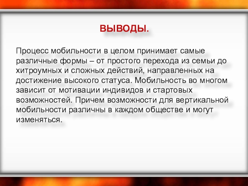 простого перехода из семьи до хитроумных и сложных действий, направленных на достижение высокого статуса. Мобильность во многом зависит от мотивации индивидов и стартовых возможностей. Причем возможности для вертикальной мобильности различны в каждом обществе и могут изменяться.