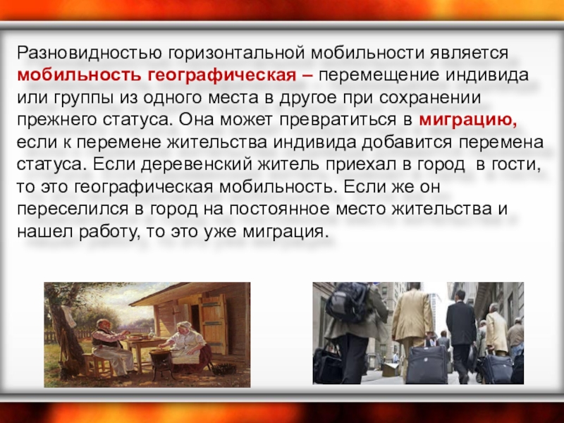 Слайд 6Разновидностью горизонтальной мобильности является мобильность географическая – перемещение индивида или группы