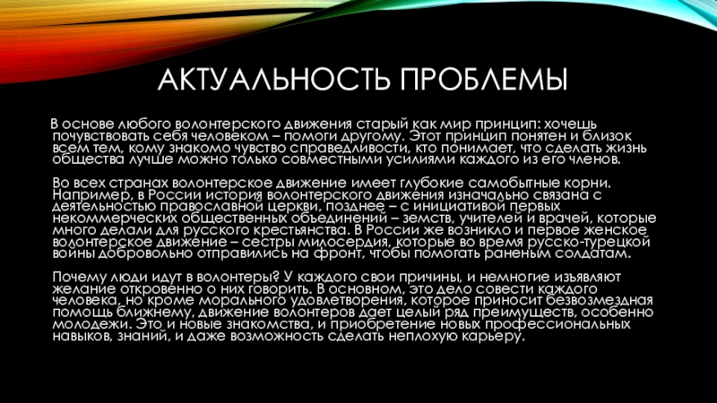 Почему люди идут в волонтеры? У каждого свои причины, и немногие изъявляют желание откровенно о них говорить. В основном, это дело совести каждого человека, но кроме морального удовлетворения, которое приносит безвозмездная помощь ближнему, движение волонтеров дает целый ряд преимуществ, особенно молодежи. Это и новые знакомства, и приобретение новых профессиональных навыков, знаний, и даже возможность сделать неплохую карьеру.