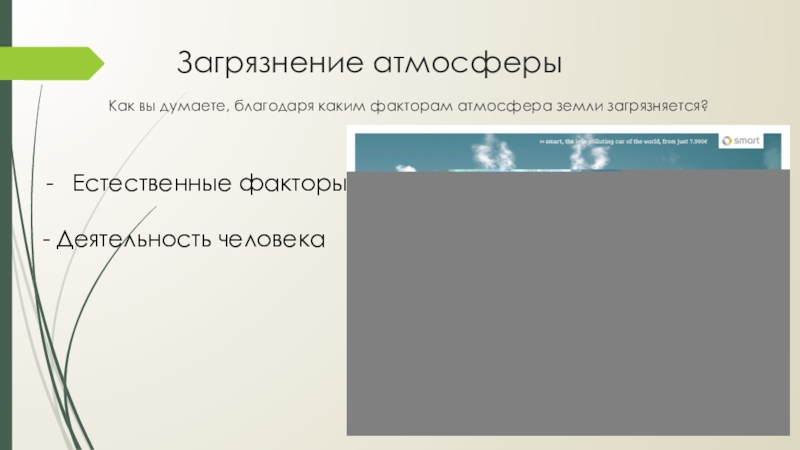 Загрязнение атмосферыКак вы думаете, благодаря каким факторам атмосфера земли загрязняется?Естественные факторы- Деятельность человека