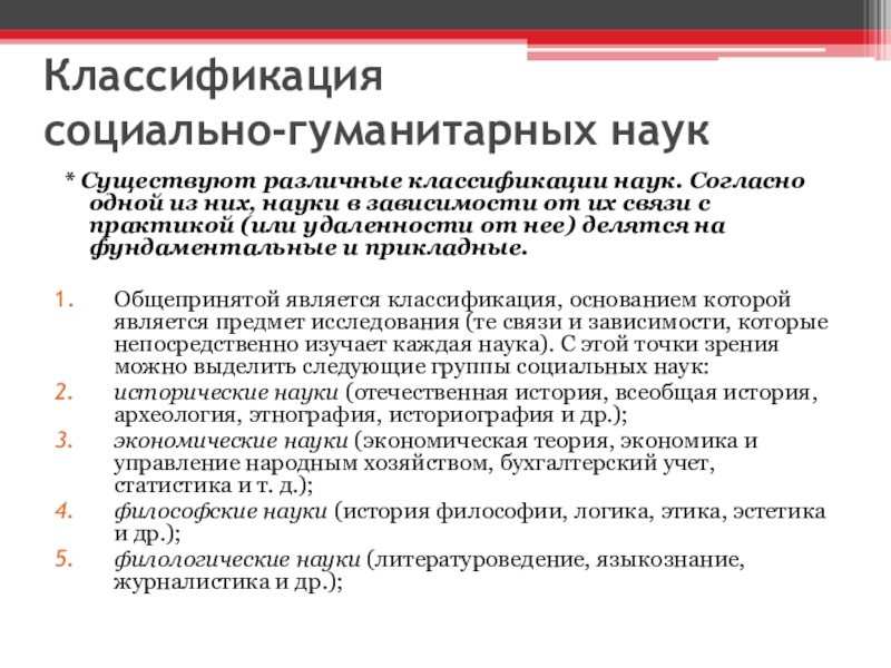 Классификация  социально-гуманитарных наук * Существуют различные классификации наук. Согласно одной из них, науки в зависимости от