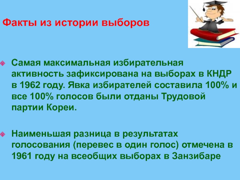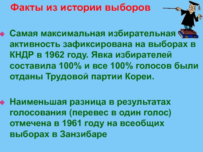 Наименьшая разница в результатах голосования (перевес в один голос) отмечена в 1961 году на всеобщих выборах в Занзибаре