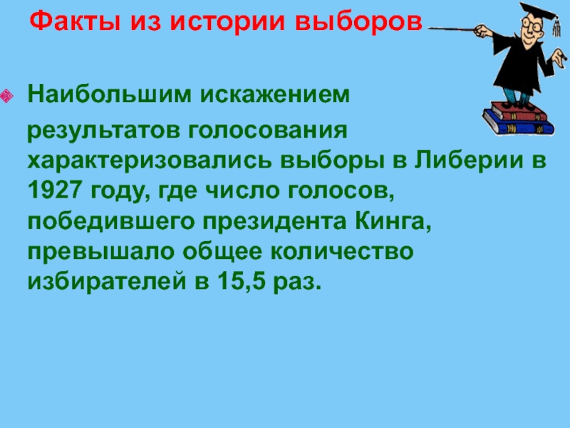 характеризовались выборы в Либерии в 1927 году, где число голосов, победившего президента Кинга, превышало общее количество избирателей в 15,5 раз.