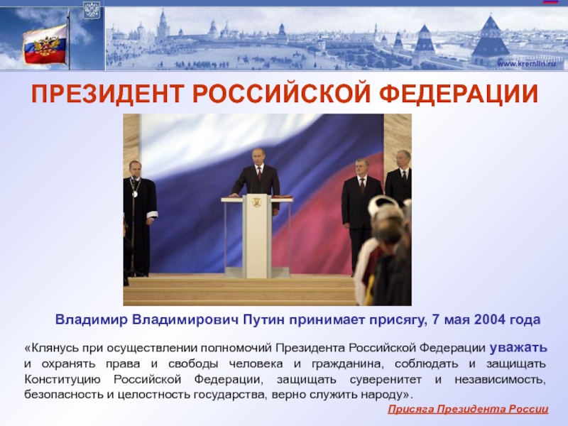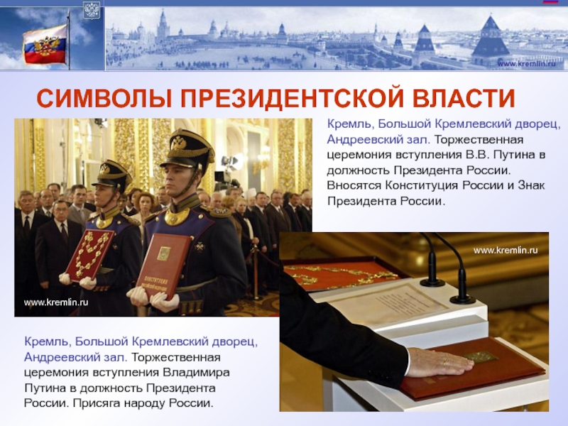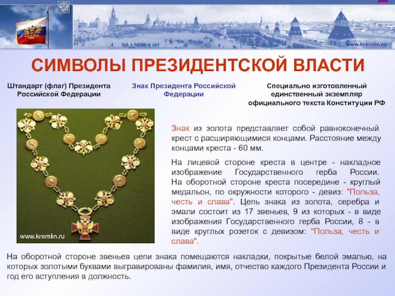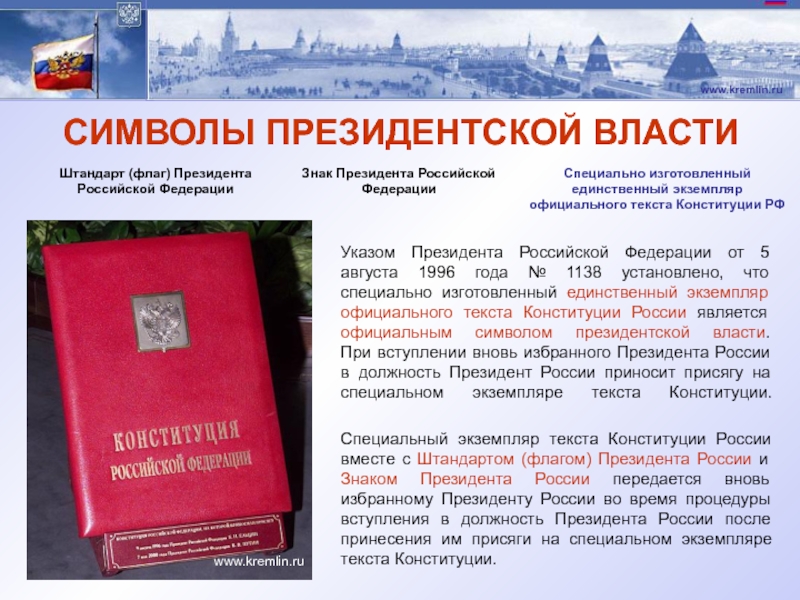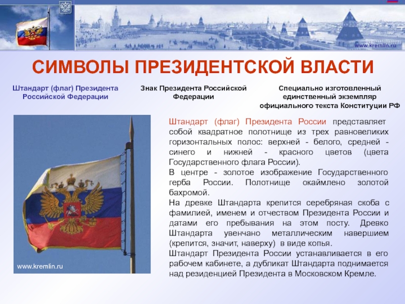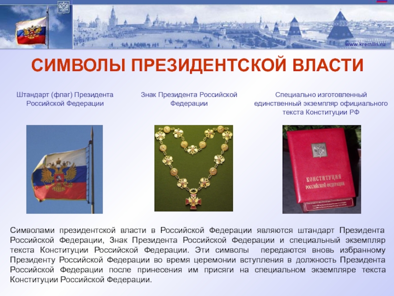 Штандарт (флаг) Президента Российской Федерации	Знак Президента Российской    Федерации	Специально изготовленный единственный экземпляр официального текста Конституции