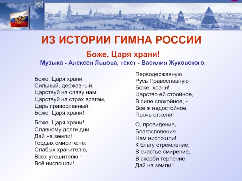 Боже, Царя храни! Музыка - Алексея Львова, текст - Василия Жуковского.