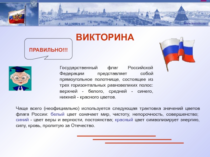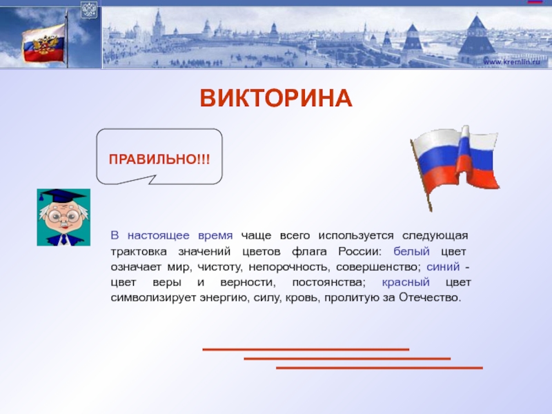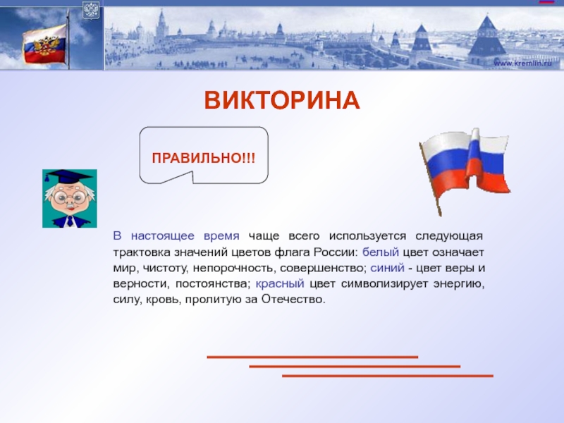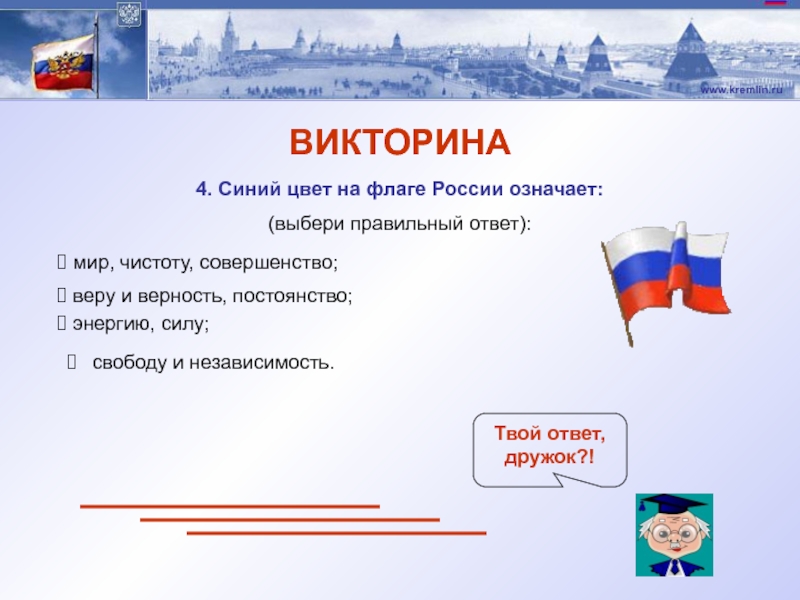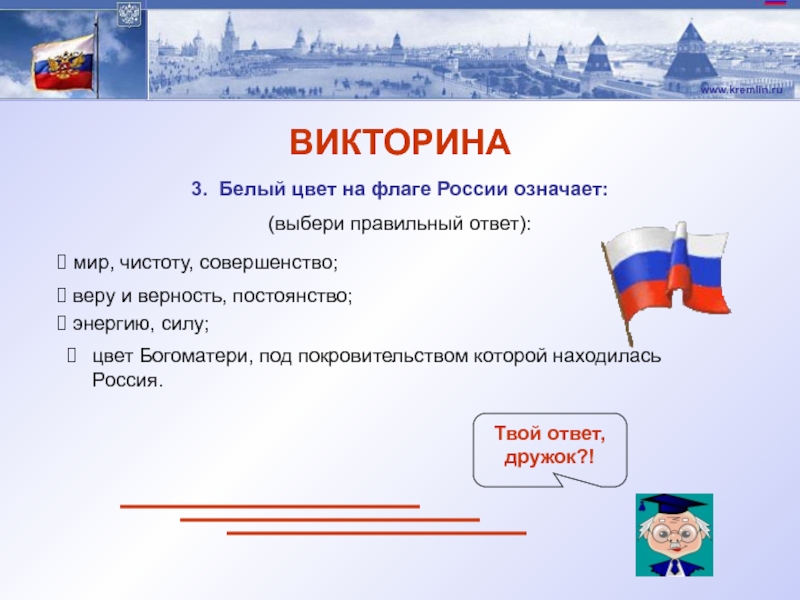ВИКТОРИНА3. Белый цвет на флаге России означает: (выбери правильный ответ):Твой ответ, дружок?! мир, чистоту, совершенство; веру и