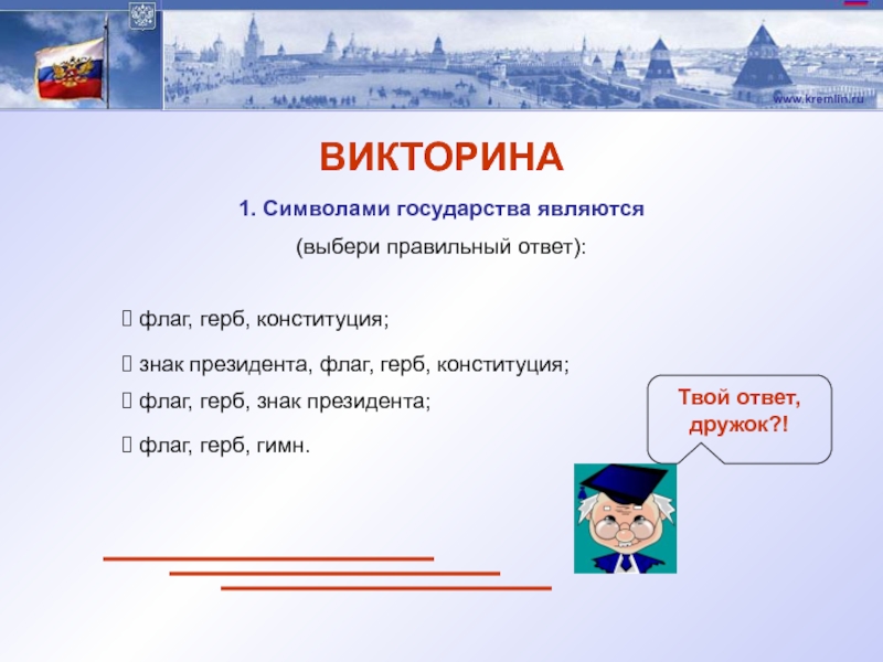 ВИКТОРИНА1. Символами государства являются (выбери правильный ответ): флаг, герб, конституция; знак президента, флаг, герб, конституция; флаг, герб,