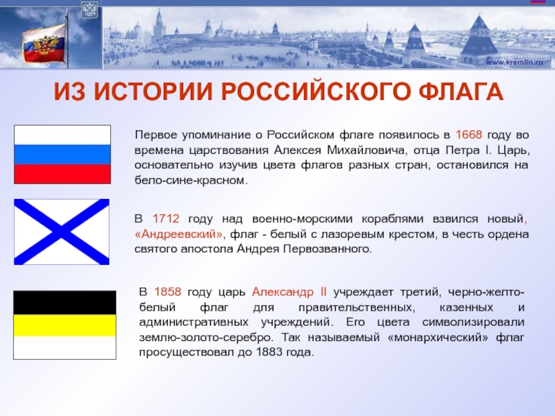 Слайд 13ИЗ ИСТОРИИ РОССИЙСКОГО ФЛАГА