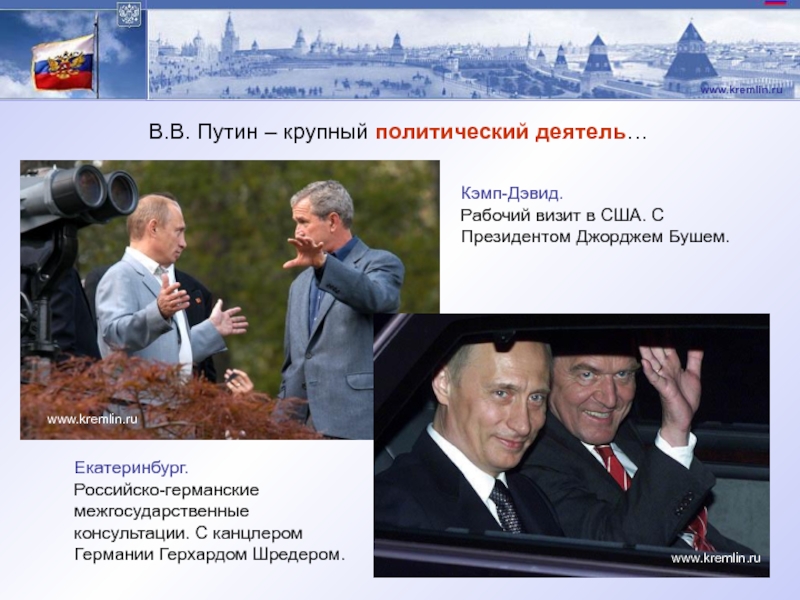 В.В. Путин – крупный политический деятель…Кэмп-Дэвид. Рабочий визит в США. С Президентом Джорджем Бушем. Екатеринбург. Российско-германские межгосударственные консультации.