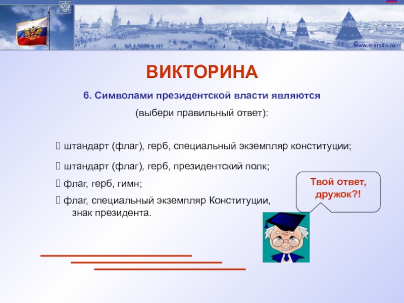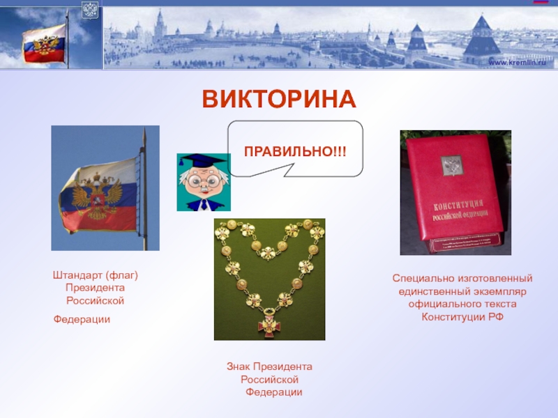 ВИКТОРИНА6. Символами президентской власти являются (выбери правильный ответ): штандарт (флаг), герб, специальный экземпляр конституции; штандарт (флаг), герб,
