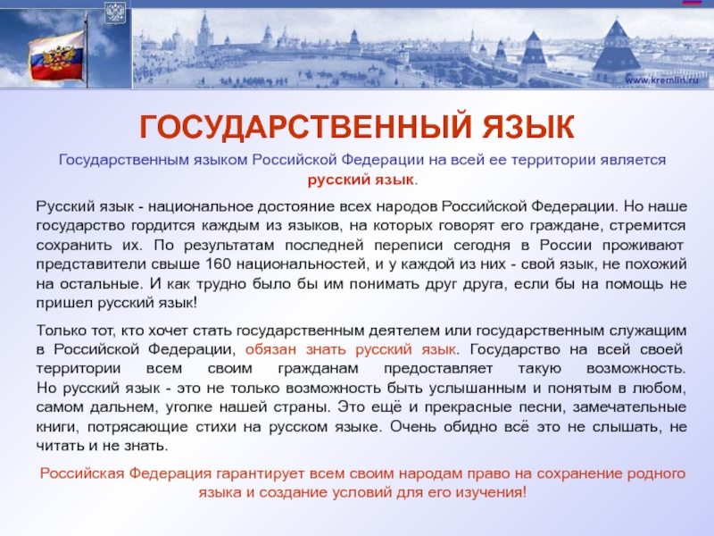 ГОСУДАРСТВЕННЫЙ ЯЗЫКГосударственным языком Российской Федерации на всей ее территории является русский язык. Русский язык - национальное достояние