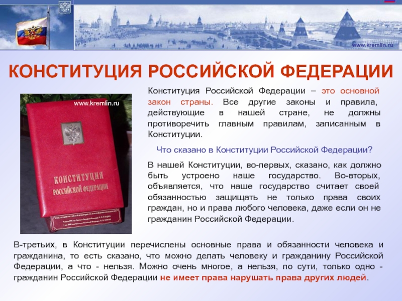 КОНСТИТУЦИЯ РОССИЙСКОЙ ФЕДЕРАЦИИКонституция Российской Федерации – это основной закон страны. Все другие законы и правила, действующие в