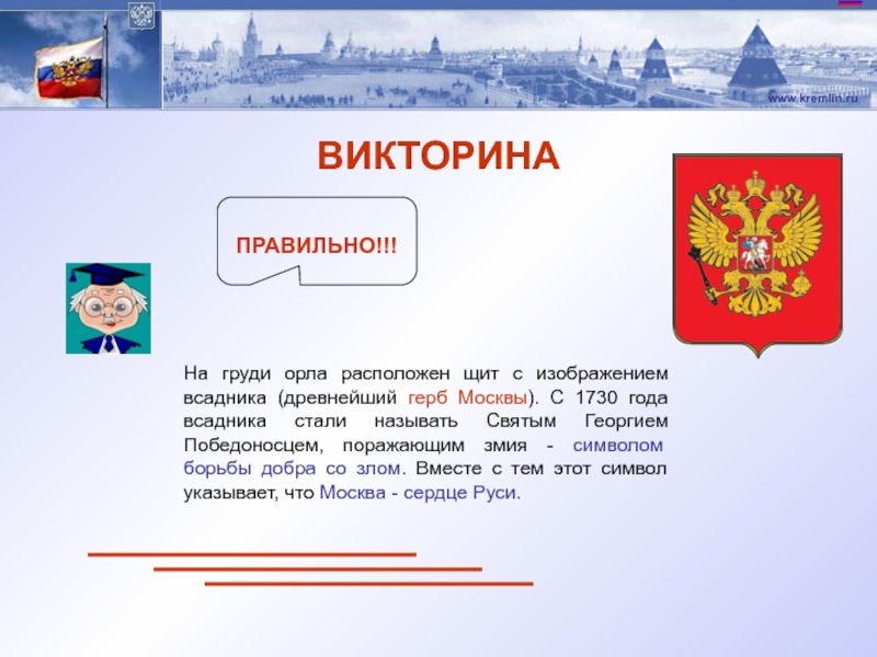 ВИКТОРИНАНа груди орла расположен щит с изображением всадника (древнейший герб Москвы). С 1730 года всадника стали называть