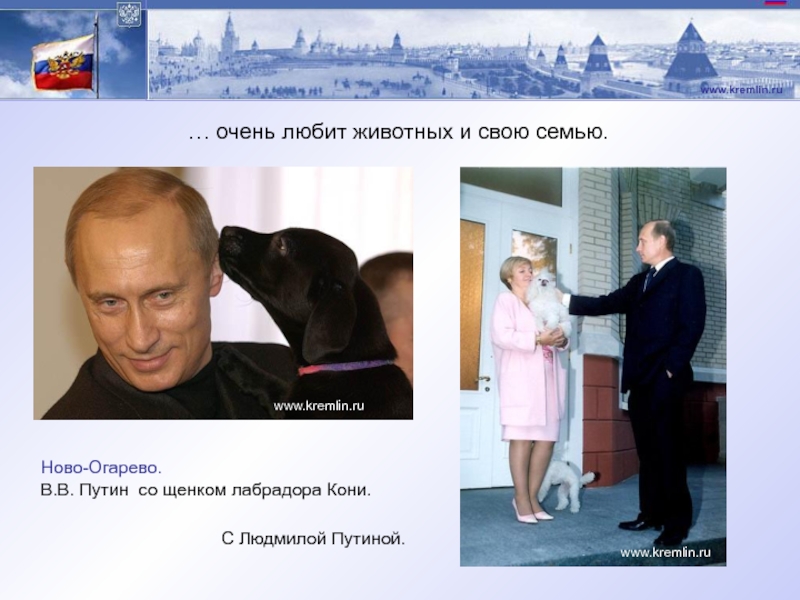 … очень любит животных и свою семью.Ново-Огарево. В.В. Путин со щенком лабрадора Кони. С Людмилой Путиной.www.kremlin.ruwww.kremlin.ru