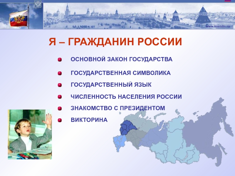 ГОСУДАРСТВЕННАЯ СИМВОЛИКАЗНАКОМСТВО С ПРЕЗИДЕНТОМЯ – ГРАЖДАНИН РОССИИВИКТОРИНАОСНОВНОЙ ЗАКОН ГОСУДАРСТВАГОСУДАРСТВЕННЫЙ ЯЗЫКЧИСЛЕННОСТЬ НАСЕЛЕНИЯ РОССИИ