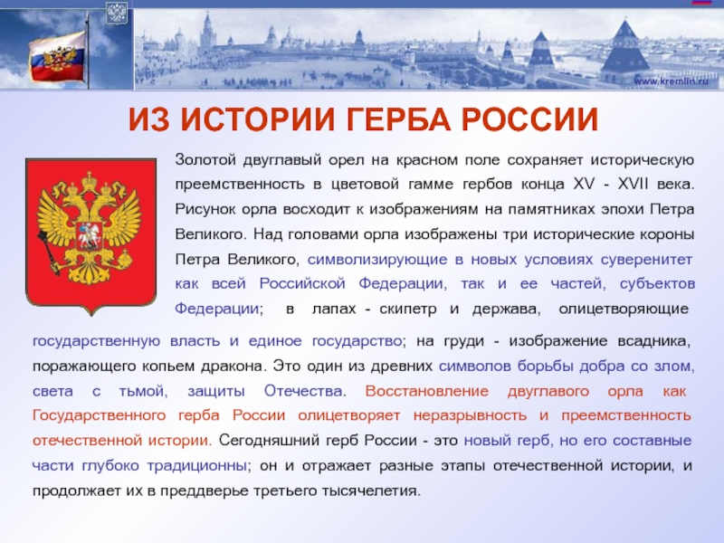 копьем дракона. Это один из древних символов борьбы добра со злом, света с тьмой, защиты Отечества. Восстановление двуглавого орла как Государственного герба России олицетворяет неразрывность и преемственность отечественной истории. Сегодняшний герб России - это новый герб, но его составные части глубоко традиционны; он и отражает разные этапы отечественной истории, и продолжает их в преддверье третьего тысячелетия.