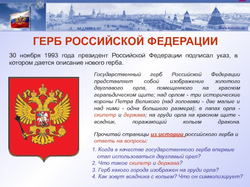 ГЕРБ РОССИЙСКОЙ ФЕДЕРАЦИИ30 ноября 1993 года президент Российской Федерации подписал указ, в котором дается описание нового герба.