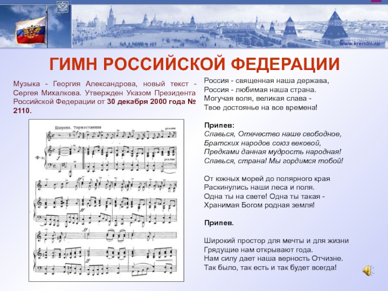 Музыка - Георгия Александрова, новый текст - Сергея Михалкова. Утвержден Указом Президента Российской Федерации от 30 декабря 2000 года № 2110.