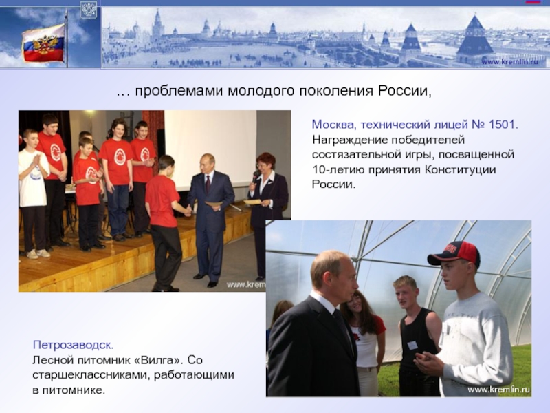 … проблемами молодого поколения России,www.kremlin.ruПетрозаводск.  Лесной питомник «Вилга». Со старшеклассниками, работающими в питомнике.Москва, технический лицей №