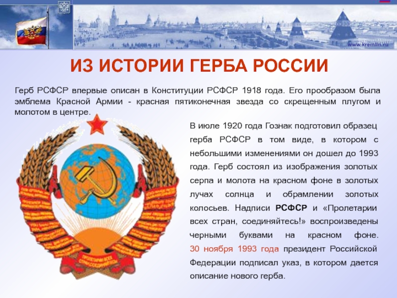 виде, в котором с небольшими изменениями он дошел до 1993 года. Герб состоял из изображения золотых серпа и молота на красном фоне в золотых лучах солнца и обрамлении золотых колосьев. Надписи РСФСР и «Пролетарии всех стран, соединяйтесь!» воспроизведены черными буквами на красном фоне. 30 ноября 1993 года президент Российской Федерации подписал указ, в котором дается описание нового герба.