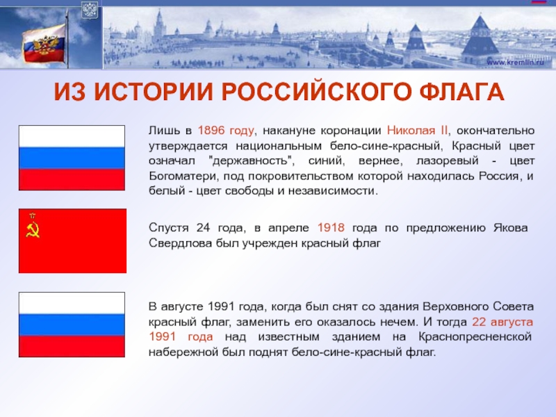 Официально бело-сине-красный флаг был утвержден как официальный (государственный) флаг России только накануне коронации Николая II в 1896 г. Тогда красный цвет означал державность, синий – цвет Богоматери, под покровительством которой находилась Россия, белый – цвет свободы и независимости.