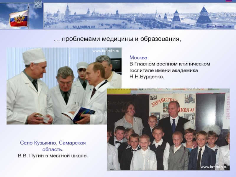 … проблемами медицины и образования,Москва. В Главном военном клиническом госпитале имени академика Н.Н.Бурденко.Село Кузькино, Самарская область. В.В.
