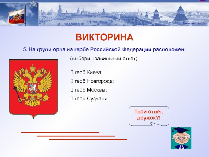 ВИКТОРИНА5. На груди орла на гербе Российской Федерации расположен: (выбери правильный ответ): герб Киева; герб Новгорода; герб