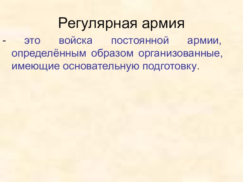 Регулярная армия- это войска постоянной армии, определённым образом организованные, имеющие основательную подготовку.