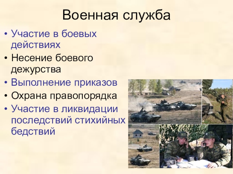 Военная службаУчастие в боевых действияхНесение боевого дежурстваВыполнение приказовОхрана правопорядкаУчастие в ликвидации последствий стихийных бедствий