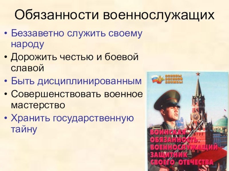Обязанности военнослужащихБеззаветно служить своему народуДорожить честью и боевой славойБыть дисциплинированнымСовершенствовать военное мастерствоХранить государственную тайну