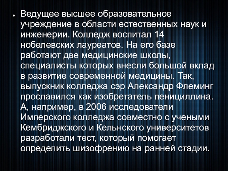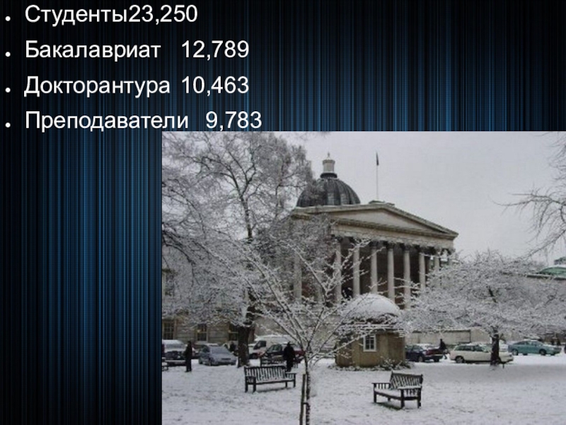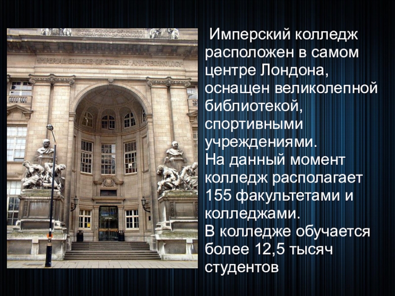 Слайд 31 Имперский колледж расположен в самом центре Лондона, оснащен великолепной библиотекой,