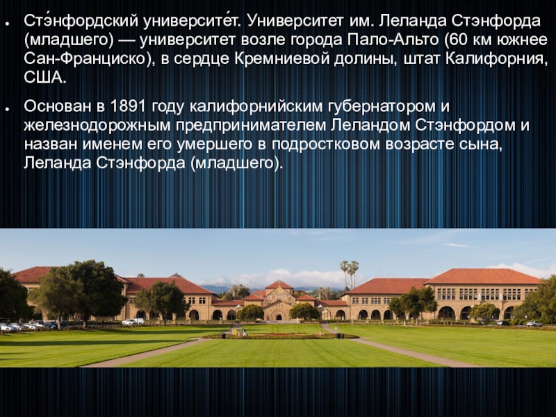 Слайд 17Стэ́нфордский университе́т. Университет им. Леланда Стэнфорда (младшего) — университет возле города