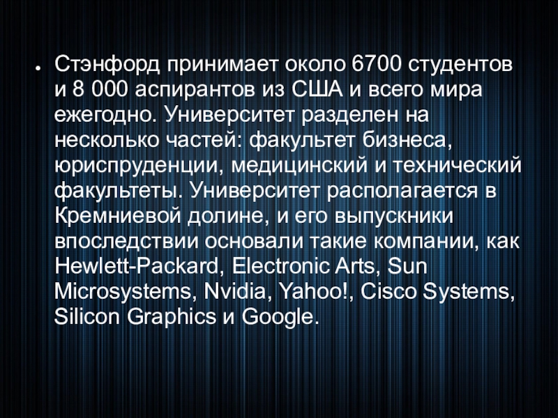 и всего мира ежегодно. Университет разделен на несколько частей: факультет бизнеса, юриспруденции, медицинский и технический факультеты. Университет располагается в Кремниевой долине, и его выпускники впоследствии основали такие компании, как Hewlett-Packard, Electronic Arts, Sun Microsystems, Nvidia, Yahoo!, Cisco Systems, Silicon Graphics и Google.