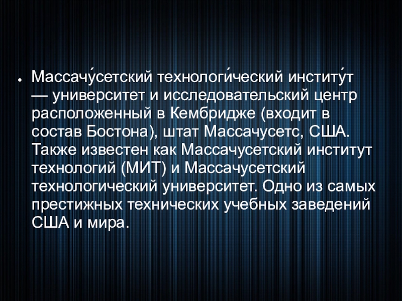 Слайд 48Массачу́сетский технологи́ческий институ́т — университет и исследовательский центр расположенный в Кембридже