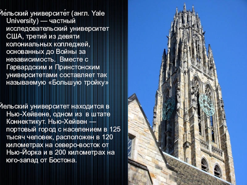 Слайд 12Йе́льский университе́т (англ. Yale University) — частный исследовательский университет США, третий