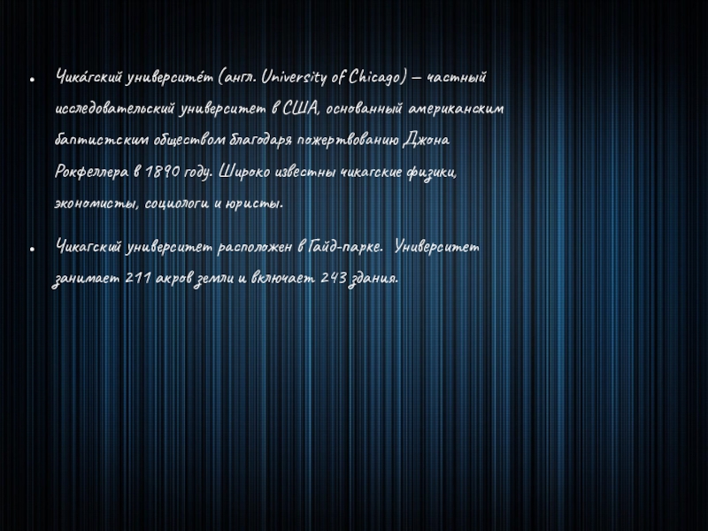 Слайд 7Чикáгский университéт (англ. University of Chicago) — частный исследовательский университет в