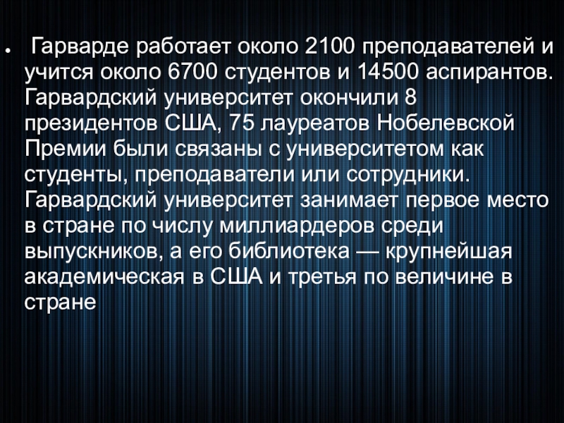 и 14500 аспирантов. Гарвардский университет окончили 8 президентов США, 75 лауреатов Нобелевской Премии были связаны с университетом как студенты, преподаватели или сотрудники. Гарвардский университет занимает первое место в стране по числу миллиардеров среди выпускников, а его библиотека — крупнейшая академическая в США и третья по величине в стране