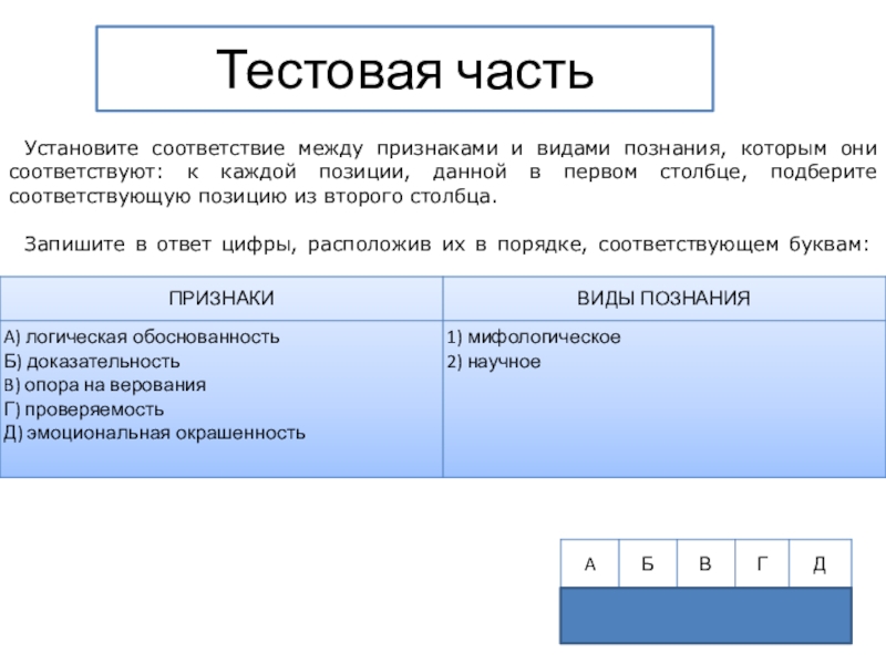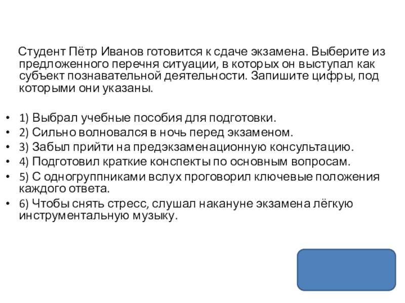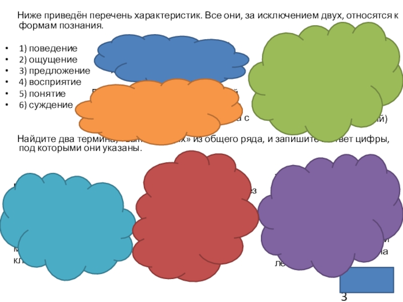 2) одно предложение с информацией о формах чувственного познания, опирающейся на знания курса, например: Принято выделять три формы чувственного познания: ощущение, восприятие, представление;