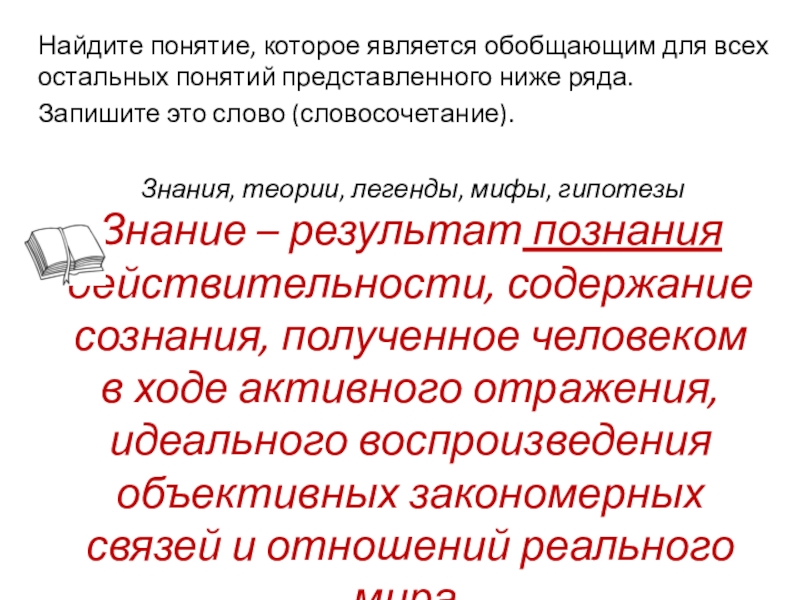 Научное знание – понимание действительности в ее прошлом, настоящем и будущем, достоверное обобщение фактов, осуществляет предвидение различных явлений.