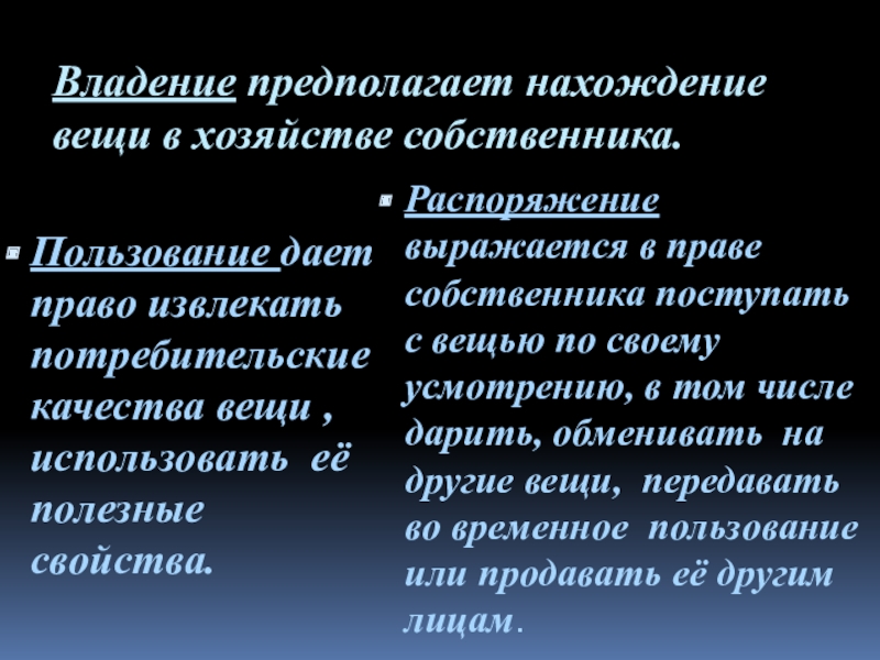 Распоряжение выражается в праве собственника поступать с вещью по своему усмотрению, в том числе дарить, обменивать на другие вещи, передавать во временное пользование или продавать её другим лицам.