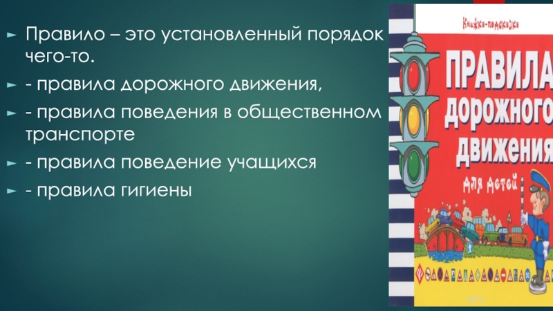 Правило – это установленный порядок чего-то. - правила дорожного движения, - правила поведения в общественном транспорте -