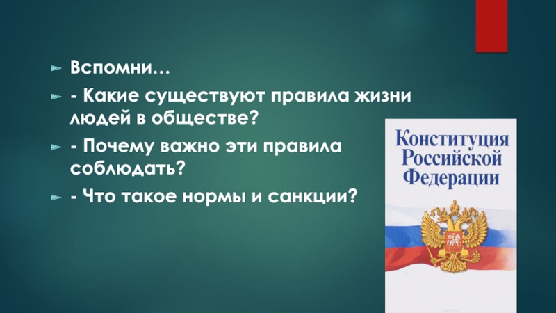 Вспомни… - Какие существуют правила жизни людей в обществе? - Почему важно эти правила соблюдать? - Что