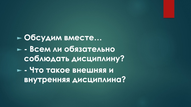 Обсудим вместе… - Всем ли обязательно соблюдать дисциплину? - Что такое внешняя и внутренняя дисциплина?